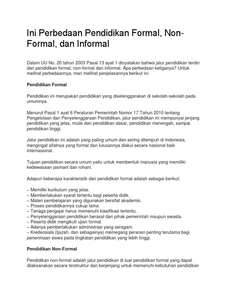 Pendidikan non-formal adalah jalur pendidikan di luar sistem formal yang tetap dapat diselenggarakan secara terstruktur dan berjenjang. Tujuannya adalah memberikan kesempatan belajar bagi masyarakat yang membutuhkan keterampilan atau pengetahuan tertentu di luar lingkungan sekolah. Bentuk-bentuk pendidikan non-formal seperti kursus, pelatihan, dan program kesetaraan (Paket A, B, C) sangat bermanfaat bagi masyarakat yang tidak dapat mengikuti jalur pendidikan formal. -